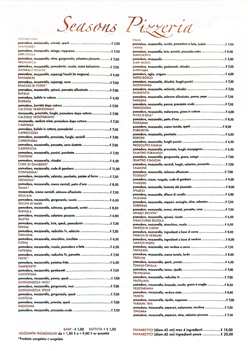 Seasons Pizzeria Ristorante in Fontaniva offers an authentic Italian dining experience centered around exceptional pizza. The menu shines with classic and creative pies, including the highly recommended Zingare, praised for its rich flavors and perfectly balanced ingredients. Beyond pizza, the selection extends to delightful Italian desserts, complementing a meal that feels both traditional and fresh.